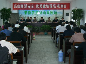 由省科技厅、省农科院组织的“砀山酥梨安全、优质栽培现场观摩会”在砀山果园场召开。9月7日,省科技厅、省农科院有关领导及果树专家和宿州市农委、砀山县农委、砀山县种质资源办公室、砀山县园艺场、砀山县各农技站站长及肖县农委、肖县东阁园艺场等单位共50余人,在砀山县政府人员的陪同下,到砀山果园场、砀山县园艺场“砀山酥梨安全标准化栽培技术示范园”进行现场观摩。