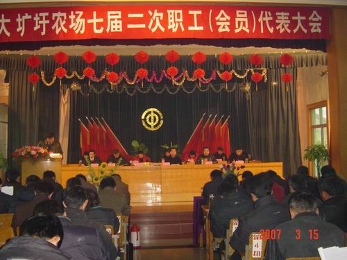 早春三月,万象更新。在这个美好的季节里,大圹圩农场七届二次职工(会员)于3月15日—16日在场部礼堂胜利召开。来自全场各单位79名正式代表和11名特邀代表计90人参加了本次会议。场领导徐成银、施广庆、殷文格、杨朝幸、李家华、沈永辉在主席台前排就坐。