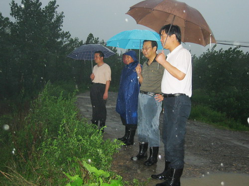 李总一到寿西湖便冒雨匆匆赶往种子公司认真检查排涝抢险工作,接着马不停蹄驱车驶入湖区仔细察看各分场的防汛工作和受灾情况,最后赶到九里涵闸(悬在寿西湖农场头上的一把利剑)重点了解了寿西截涝堤的水位和汛情。