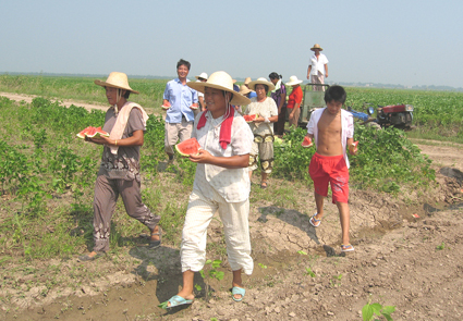 今年的8月1日,是中国人民解放军建军80周年纪念日。一大早,焦岗湖农场就将满满两四轮西瓜送往武警官兵临时住地----焦岗湖农场一分场和鲁口中学。