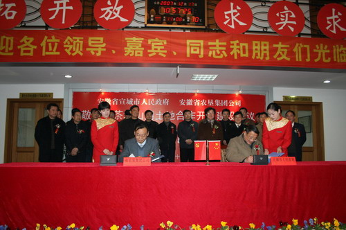为实施农垦集团化、产业化、投资主体多元化发展战略,安徽省农垦集团公司与宣城市人民政府经过多轮洽谈,达成一致协议,共同开发农垦敬亭山茶场山南土地,建设宣城市水阳江大道。12月17日,省农垦集团公司总经理李卓民与宣城市委常委、常务副市长章钢分别代表省农垦集团公司和宣城市人民政府在合作协议上正式签字,并为敬亭山茶场山南地区开发建设领导小组揭牌。出席签字仪式的有,省农垦集团公司副总经理程军、宣城市人民政府副市长夏月星、市政府副主席吴瑞荣及宣城市有关部门的领导、敬亭山茶场及农垦有关部门负责人。
