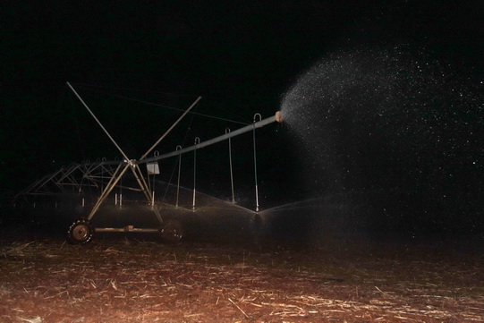 按时播种是前提,及时灌溉是保证。为克服白天无电的困扰,皖津公司利用夜晚有电之隙,能喷即喷。5月17日夜,随着马达声起,第一滴甘露喷洒入地,拉开了小麦喷灌序幕,修复后的喷灌机状态良好,旋转的龙头强劲有力,喷洒的雨露滋润人心。