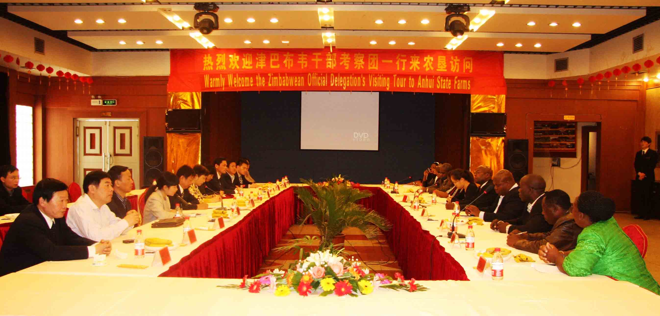 随后,安徽农垦集团副总经理王占廷主持召开座谈会,对远道而来的非洲朋友表达了真诚热烈的欢迎。会议播放了英语版的《安徽农垦》专题宣传片,介绍了近年来安徽农垦实施“三化”战略、深化体制改革、调整产业结构、转变发展方式、努力促进“三增”、实现垦区全面发展的情况。王占廷着重介绍了安徽农垦集团与津巴布韦农业合作项目的实施和进展情况。