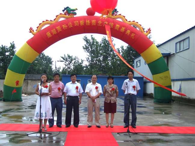 7月22日上午,皖垦食品集团雁湖面粉公司新挂面生产线建设工程工地上彩旗飘扬,鞭炮齐鸣,雁湖面粉公司新挂面生产线奠基仪式在这里隆重举行。皖垦食品集团(龙亢农场)领导杨俊宇等出席奠基仪式,食品集团(龙亢农场)机关、社区各部门负责人,雁湖面粉公司董事会成员以及公司部分员工参加开工典礼。雁湖面粉公司挂面生产线一期工程,为两条新一代765型生产线,日产挂面80吨,其集传统低温、中温挂面设备优势为一身,传动平稳,自动化程度高,能耗较低,能耗为传统低温的80%,温湿度曲线非常理想,挂面烘干时间约为6小时,挂面质量较好。计划在2009年年底建成。建成后,雁湖面粉公司可生产各种营养、特色挂面,可进一步提高产品的市场占有率和品牌的知名度。