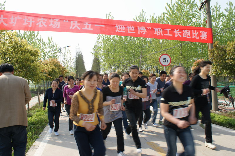 为庆祝“五一”国际劳动节,喜迎上海世博会, 4月30日,大圹圩农场工会举办“庆五一、迎世博”职工长跑比赛活动,全场13个基层工会70名选手参与了6000多米的长跑比赛。