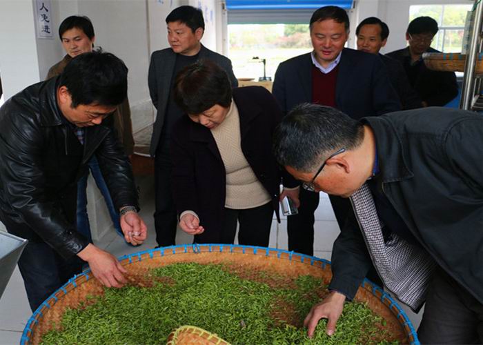 3月27至28日,安徽农垦集团总会计师高有荣率总助凌军及资产部、审计室负责人一行在皖垦茶区调研督导,实地检查了宝莲山文化陵园、十字铺茶兴小区改造、青草湖泵站建设、敬亭绿雪生产线升级、祠山岗加油加气站等在建项目进展情况,在祠山岗黄金芽茶生产基地、敬亭绿雪公司生产车间调研了春茶生产情况。