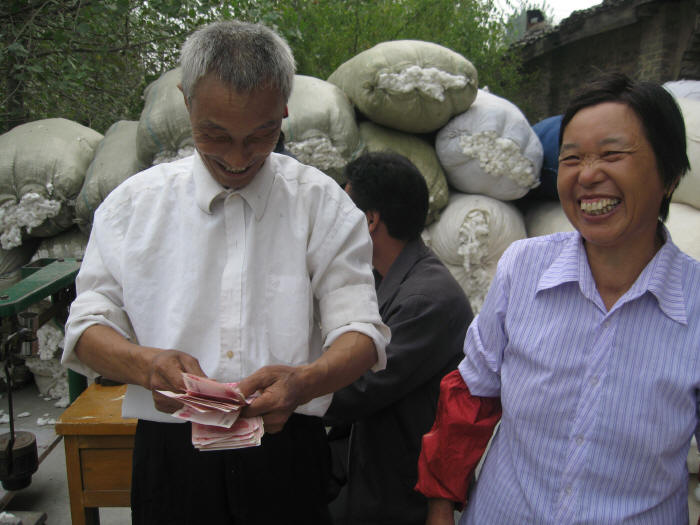 10月10日上午,安徽农垦皖河农场红旗分场棉农何银伢在当地一家棉花企业交售棉花,他交售的籽棉重300多公斤,收购价为3.13元/市斤(衣分38.5%、水分13点以内),单笔结算现金2037元。何银伢说:“政策好、天帮忙、人努力,市场旺,今年是个丰收年!”