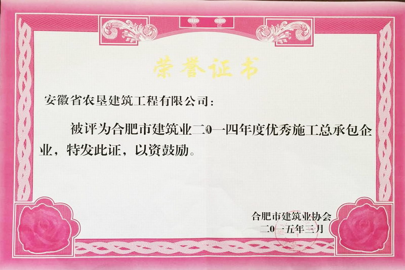 近日,安徽垦建公司获评合肥市建筑业上年度优秀施工总承包企业。2014年,垦建人直面纷繁复杂的市场环境,抢抓机遇,上下一心,以抓经营促发展、抓质量促信誉、抓安全促效益,不断总结经验,各项工作都取得了好成绩。