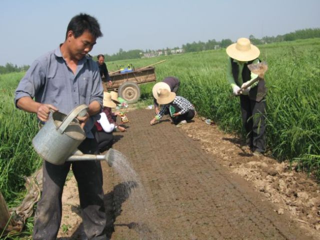 4月25日下午,安徽省皖河农场双河分场种棉大户王长节正在钵床浇水,他聘请的“钟点工”忙着抢播棉种。至此,全场2万亩棉花播种接近尾声。根据节令,四月上旬就有棉农为棉籽下种准备营养土,中旬和下旬进入打钵抢种的高峰期。针对大批劳动力外出务工的情况,不少种棉大户购置了育苗压钵机,通过机械化方式打钵下种。今年是该场棉农享受棉种补贴的第二年,每亩发放价值15元的优质棉种,加上棉农自行选购,良种覆盖率达100%。