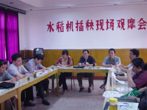 与会同志在大圹圩农场领导及有关同志的陪同下, 实地察看了该场七分场、六分场机械化插秧现场, 了解了机插秧的技术特性及要求。听取了徐成银场 长有关水稻机插秧试验项目实施情况的汇报。大圹 圩农场是农业部确定的“机械化插秧重点示范 场”,今年购置插秧机10台,示范推广机插秧面积 2000亩,涉及四、五、六、七4个分场33户家庭农 场。为了调动广大职工对机插秧试验推广工作的积 极性,农场采取一系列优惠政策。目前,整个试验 实施情况较好,达到了预期的效果。通过参观和听 取汇报,与会同志启发和感触很大,分别谈了各自 的体会及对机插秧推广前景的看法,并就有关技术 问题向厂家代表进行了咨询。程军副总经理对机插 秧成本及效益进行了测算,并要求厂家代表能具体 提供相关技术参数,为机插秧在农垦大面积推广提 供技术保证。