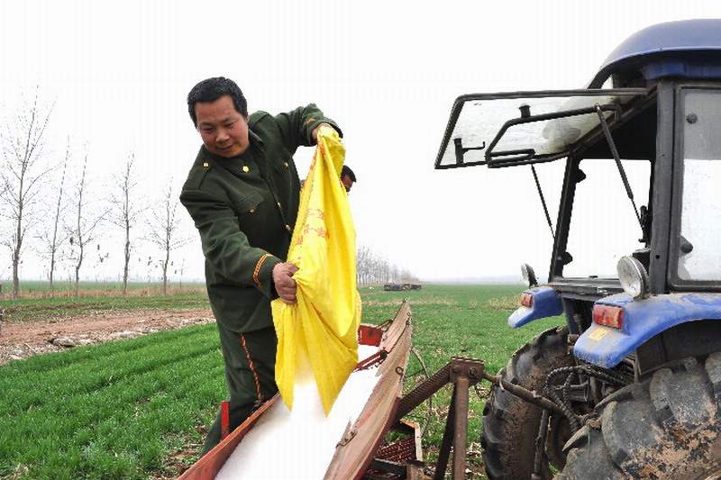 2月28日下午,潘村湖农场二管区职工范刚正在田间追施小麦返青拔节肥。2月下旬以来,该农场广大职工家庭农场在农技人员指导下,抓住当前有利时机,积极开展田管作业。