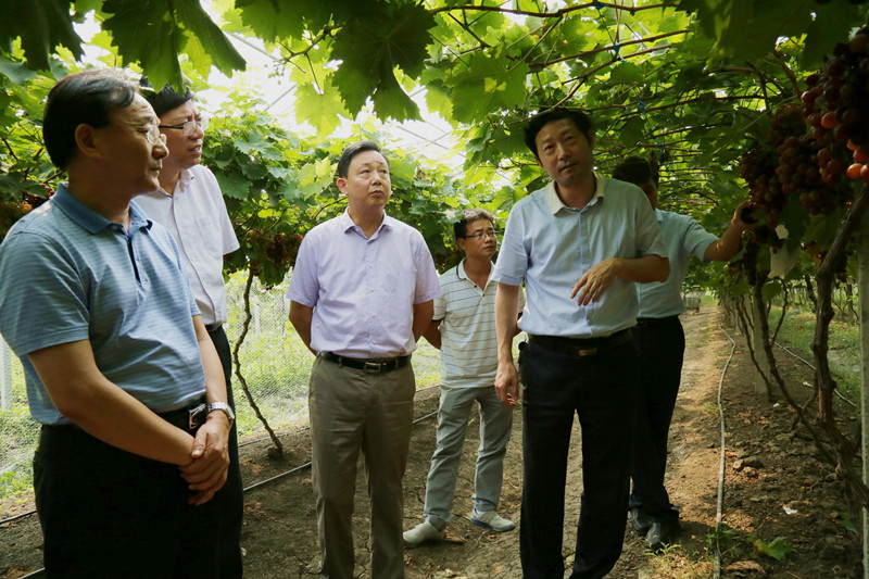徐义流一行实地调研了淮南农场“产城一体化”建设取得的成果、经验和做法,现场察看了“淮南农场杯”优质葡萄评比大赛获奖品种——四倍体玫瑰葡萄的负载量、成熟度、花芽分化等情况。徐义流认为,农场“舜耕山”牌葡萄生产管理水平较高,场里对种植户统一技术服务、统一生产管理、统一零售摊位的管理模式值得推介。他指出,葡萄生产要严控负载量、修剪好穗形,力求达到外观整齐、成熟一致,并对葡萄生产销售的有关细节作了具体指导。(陆继强 李超)