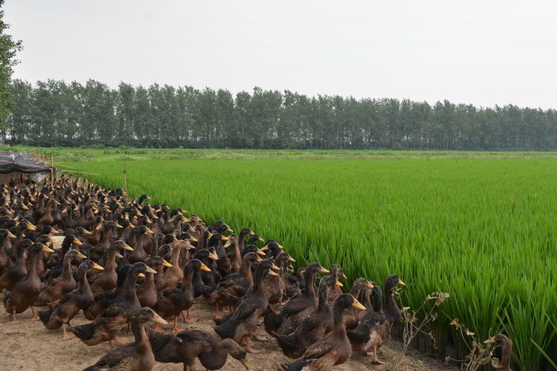 “稻鸭共生”是一种节本增效的绿色生态农业模式。安徽农垦大圹圩农场2013年开始在有机稻基地进行稻田养鸭试点,初试大获成功,当年效益颇丰。稻鸭混养今年已在农场150多亩有机稻田得到全面推广。