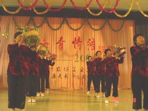 这次活动中,场工会特地为参加联欢会的来场四十 年老知青制作了纪念牌,同时,这次活动的协办单 位中国联通天长分公司还为知青们每人赠送了一份 纪念品。(图为老知青自编自演的歌伴舞〈南泥 湾〉) + ( 夏庆芳)