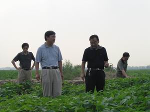 在潘村湖农场期间,李总还听取了场领导班子的集 体工作汇报,并对下一步工作提出指导意见。图为李 卓民副总经理(右二)在大田查看大豆长势。(杨 登宏)