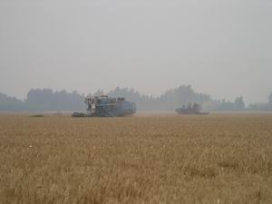6月7日下午,阴霾的天空终于露出了太阳。在潘村湖 农场七分场,10余台早已整装待发的大型收割机在分 场领导的指挥下驶向金色的原野,吹响了今年全场小 麦机收会战的进军号角。到当天晚上6点,潘村湖农 场已收割小麦3000余亩。从8日开始,各分场将调集 所有收割和运输机具收获已经成熟的小麦,确保颗粒 归仓。图为收割机在麦田来往穿梭,加紧抢收的场 景。(杨登宏摄)