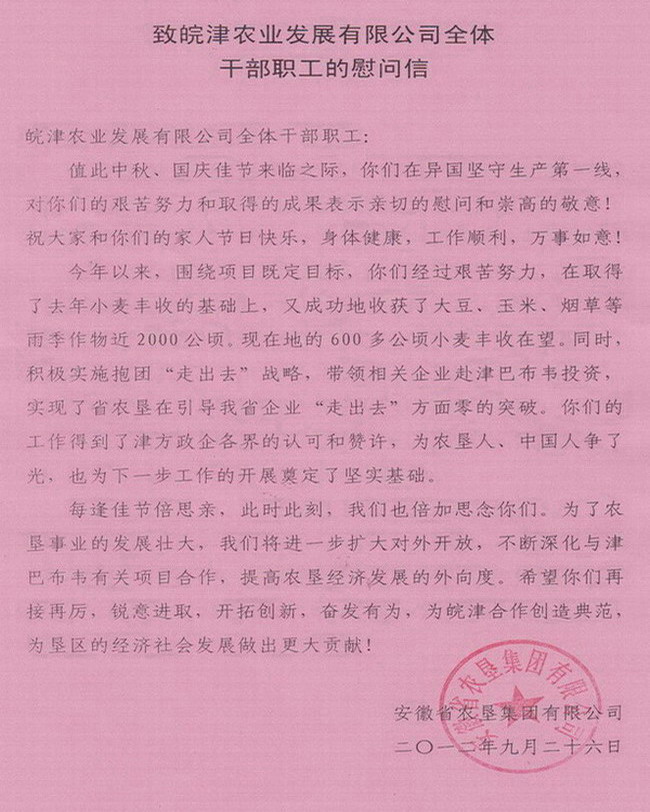 慰问信说,今年以来,围绕项目既定目标,你们经过艰苦努力,在去年取得小麦丰收的基础上,又成功地收获了大豆、玉米、烟草等雨季作物近2000公顷。现在地的600多公顷小麦丰收在望。同时,积极实施抱团“走出去”战略,带领相关企业赴津巴布韦投资,实现了省农垦在引导安徽企业“走出去”方面零的突破。你们的工作得到了津方政企各界的认可和赞许,为农垦人、中国人争了光,也为下一步工作开展奠定了坚实的基础。