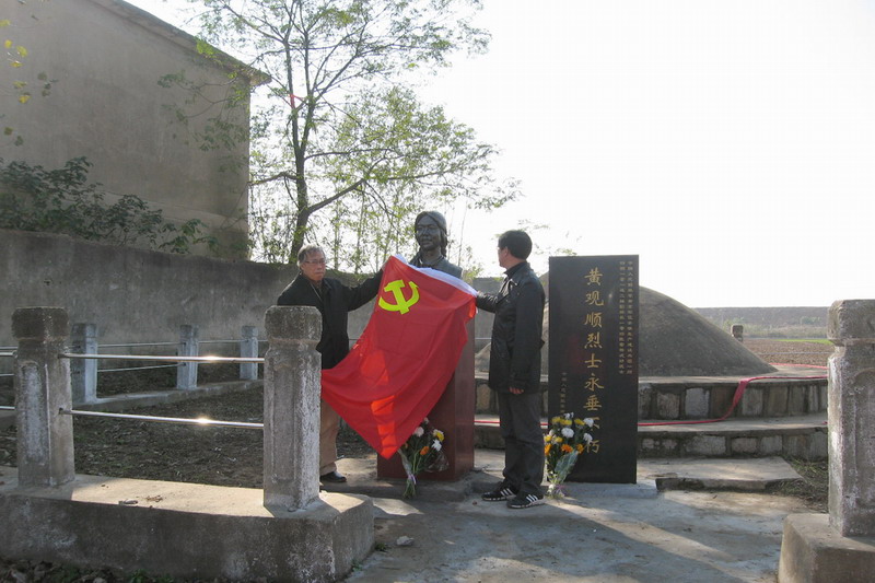 黄观顺同志系原安徽生产建设兵团一师四团一营副排长,1952年出生于上海工人家庭,1970年3月响应毛主席号召来到焦岗湖农场(原兵团四团一营),走上与工农兵相结合的道路,1971年9月加入中国共产党,1972年7月7日为救落水战友英勇献身,安徽省革委会1975年2月6日追认其为革命烈士。塑像落成实现了烈士亲友的多年夙愿。