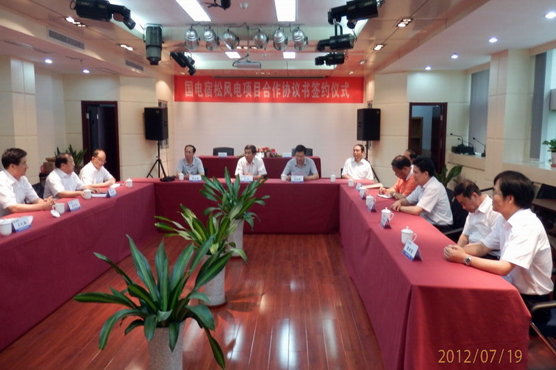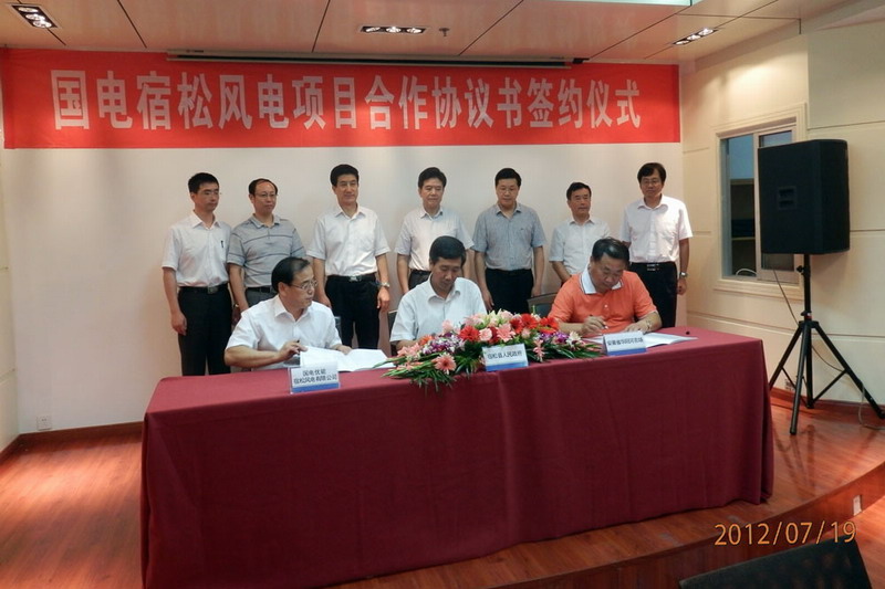 签约仪式上,储诚胜在致辞中指出,国电宿松风电项目是安徽省政府与央企对接项目、省重点项目,省农垦集团给予高度重视和大力支持,该项目实施将有力推动全省新能源建设和宿松县、华阳河农场经济转型发展,是垦地合作取得的又一新成果,有利于今后宿松县与华阳河农场合作的深化。国电安徽公司副总经理兼宿松风电公司董事长周桂冉介绍说,该合作项目是宿松县引进国电集团投资开发的风电新能源项目,其中一期工程坐落在华阳河农场境内,装机容量为49.5兆瓦,总投资达4.2亿元。王华在致辞中说,经过签约各方密切配合、通力合作,项目前期工作高效推进,为今天三方签约打好了基础,这是宿松县域内垦地合作的成功范例,签约三方将共享项目发展成果。