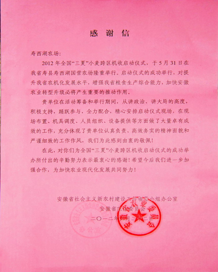 5月31日,2012年全国“三夏”小麦跨区机收启动仪式在安徽农垦寿西湖农场圆满成功举行。日前,安徽省社会主义新农村建设工作领导小组办公室、省农业委员会致信寿西湖农场,感谢在启动仪式的筹备和举行期间,从讲政治、讲大局的高度,积极支持、参与、配合,付出了辛勤努力,做了大量卓有成效的工作;同时对该农场认真负责、高效务实的精神面貌和严谨细致的工作作风给予了高度评价。(王家宇)